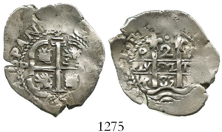 Potosi, Bolivia, cob 2 reales, 1685VR. S-P40; KM-24; CT-615. 6.9 grams. Extremely broad flan (over 30mm!), with choice full pillars-and-waves and cross-lions-castles, 3 dates, VF+ with nicely toned fields.