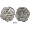 Potosi, Bolivia, cob 2 reales, 1687VR. S-P40; KM-24; CT-618. 5.7 grams. Broad but underweight flan with full cross and pillars-and-waves, 3 dates and assayers and mintmarks, non-toned AVF.