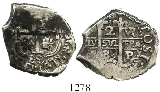 Potosi, Bolivia, cob 2 reales, 1689VR. S-P40; KM-24; CT-620. 6.8 grams. Oblong flan with choice full pillars, nearly full cross with king's ordinal II in legend, 2 bold dates, VF with mostly nice toning (some dark areas). Pedigreed to our Auction #8, with original lot-tag #1509.