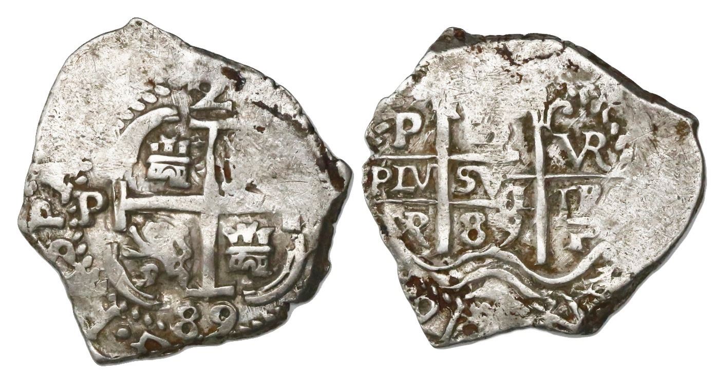 Potosi, Bolivia, cob 2 reales, 1689VR. S-P40; KM-24; CT-620. 7.46 grams. Full pillars-and-waves and cross despite flat spots, three dates and mintmarks, AXF with contrasting sediment around details, overweight.