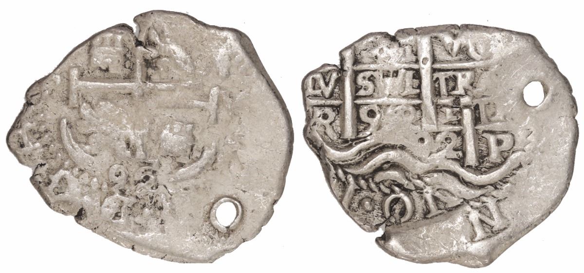 Potosi, Bolivia, cob 2 reales, 1692VR. 6.59 grams. Full and bold but doubled and off-center pillars, the cross a bit weaker but better centered, both with clear dates, AVF with hole near edge (not aligned with either axis).