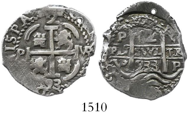 Potosi, Bolivia, cob 2 reales, 1693VR, Royal-like. S-P40; KM-24; CT-624. 6.4 grams. Broad-flan VF+ with super full cross, doubled but full and attractive pillars showing the date as "933," overall 3 dates and mintmarks and assayers, toned fields, 2 peripheral flat areas (one with scratches and the other with tiny hole).