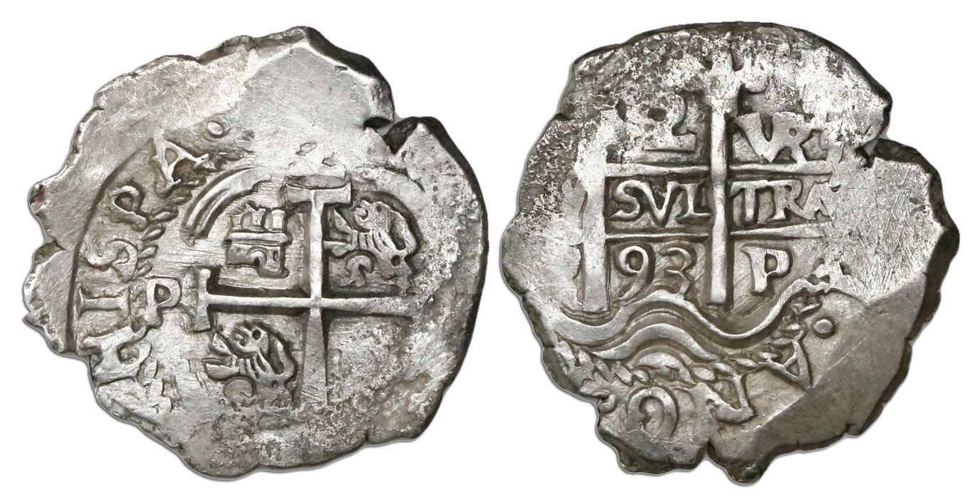 Potosi, Bolivia, cob 2 reales, 1693VR. S-P40; KM-24; CT-624. 5.91 grams. Very high grade (lustrous AU, high relief in places) with full but slightly off-center pillars-and-waves and cross-lions-castles, parts of edge crude (as made).