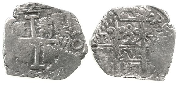 Potosi, Bolivia, cob 2 reales, 1697VR. S-P40; KM-24; CT-628. 5.1 grams. Full pillars and nearly full cross, 2 dates, bold assayer and mintmark, somewhat thin and also tangentially clipped, Fine+ with flat areas but contrasting toning.