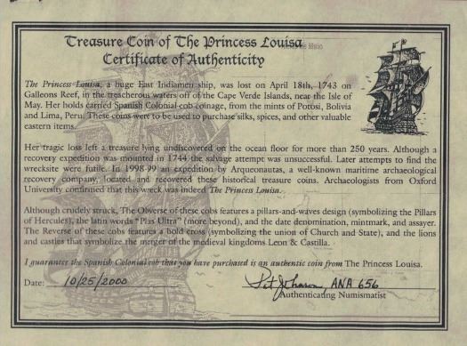 Potosi, Bolivia, cob 2 reales, 1697VR. S-P40; KM-24; CT-628. 6.69 grams. Nearly full cross and pillars-and-waves with two dates on pillars side, two full assayers, some peripheral flatness but no corrosion except for a long pit on the cross. With certificate and insert-tag, pedigreed to our Auction #14, with original lot-tag #1246. Recovered from: Princess Louisa, sunk in 1743 off the Cape Verde Islands, west of Africa