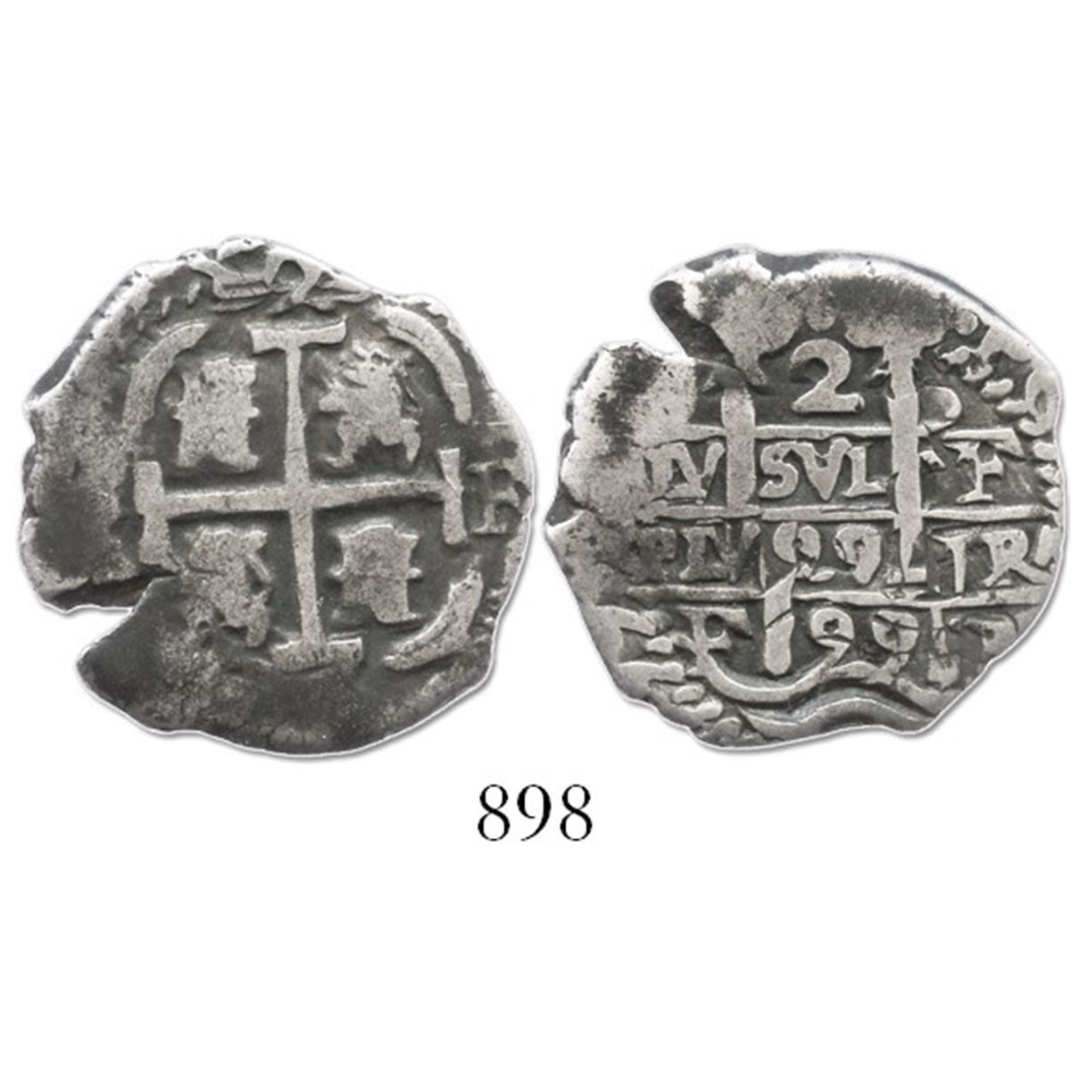 Potosi, Bolivia, cob 2 reales, 1699F. S-P42; KM-24; CT-632. 5.0 grams. Nice full cross, full but doubled pillars-and-waves with clear date and 2 assayers, richly toned Fine+ with edge-split, inexplicably underweight.