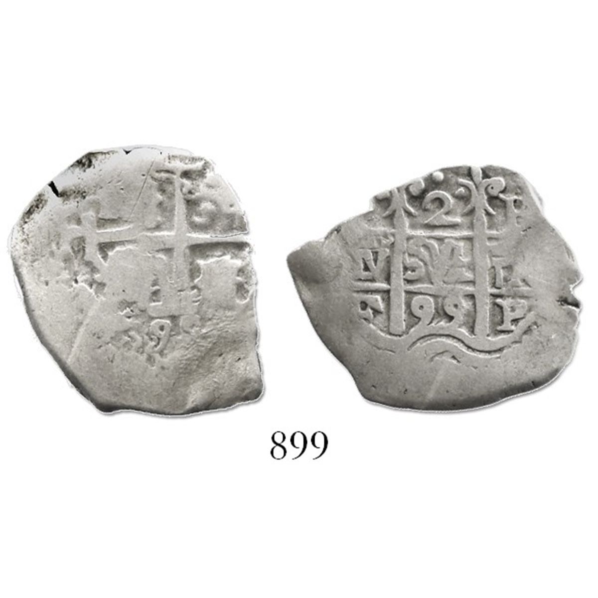 Potosi, Bolivia, cob 2 reales, 1699F. S-P42; KM-24; CT-632. 6.0 grams. Good full pillars-and-waves with clear date and 2 assayers, off-center cross with second date, About Fine. Pedigreed to Ponterio auction #54 (lot 785).