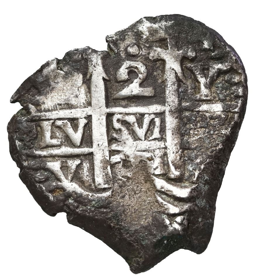 Potosi, Bolivia, cob 2 reales, 1701 Y, posthumous Charles II, very rare. S-P43; KM-24; Cal-unl. 6.94 grams. Somewhat heart-shaped flan with full pillars, off-center cross, clear CARO(LVS) on cross side, three full assayers and two dates, VF with areas of crusty dark oxidation.