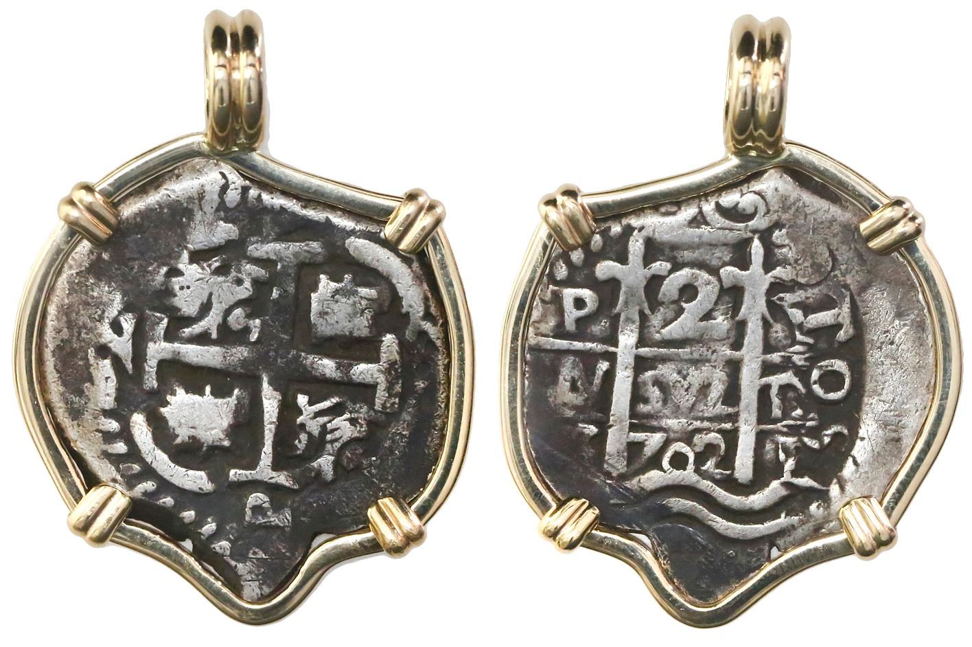 Potosi, Bolivia, cob 2 reales, 1702Y, mounted pillars-side out in 14K bezel.