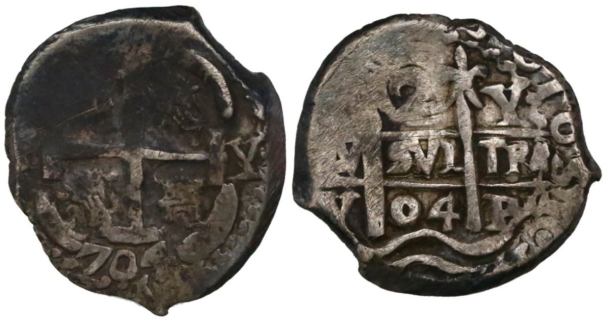Potosi, Bolivia, cob 2 reales, 1704Y. S-P43a; KM-29; CT-1326. 7.24 grams. Thick (overweight) flan with bold waves and one full pillar with bold date in two digits 04, full cross with bold three-digit date 704, three bold assayers, toned VF.