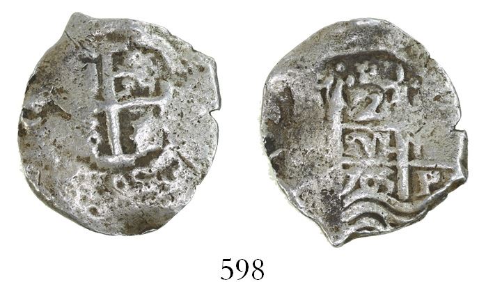Potosi, Bolivia, cob 2 reales, 1705Y. S-P43a; KM-29; CT-1327. 5.37 grams. Broad flan with nearly full pillars-and-waves and cross despite flatness and corrosion, spots of toning and sediment, two dates. Recovered from: Spanish 1715 Fleet, east coast of Florida