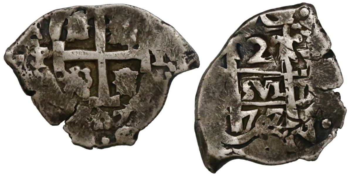 Potosi, Bolivia, cob 2 reales, 1707Y. S-P43a; KM-29; CT-1329. 5.72 grams. Bold full pillars and cross, two dates, nicely toned AVF.