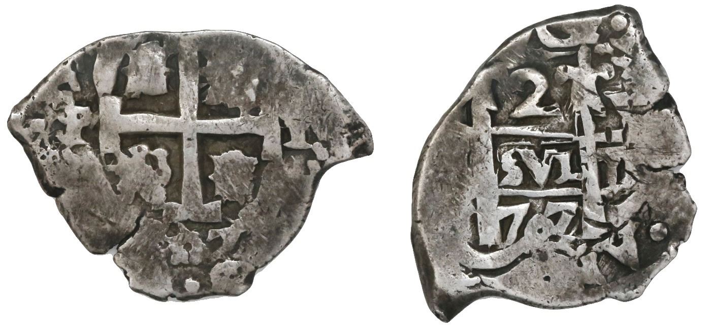 Potosi, Bolivia, cob 2 reales, 1707Y. S-P43a; KM-29; CT-1329. 5.74 grams Bold full pillars and cross, two dates, nicely toned AVF, slightly crude flan per the era. Pedigreed to our Auction #20 (lot #1973).