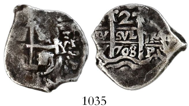 Potosi, Bolivia, cob 2 reales, 1708Y. S-P43a; KM-29; CT-1330. 6.81 grams. Full pillars with bold date, incomplete cross due to flatness, Fine with deep toning on fields (jet black), pleasing shape.