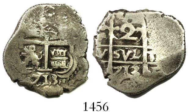 Potosi, Bolivia, cob 2 reales, 1713(Y). S-P43a; KM-29 ;CT-1335. 7.18 grams. Bold but off-center pillars, bottom half of cross, 2 bold dates, Fine+ with some flatness.