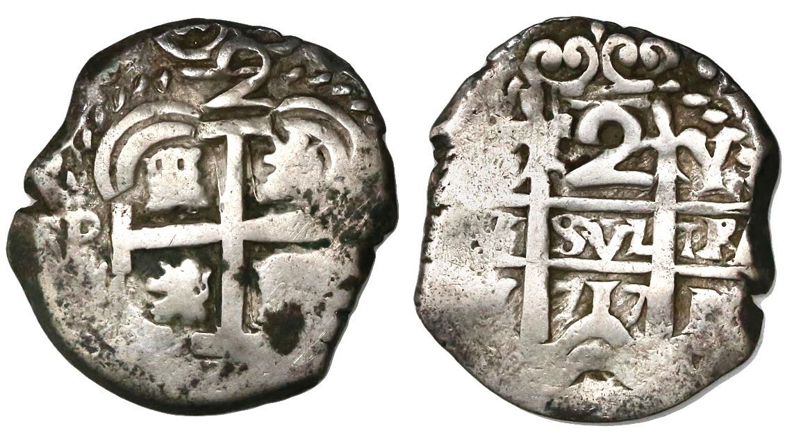 Potosi, Bolivia, cob 2 reales, 1717Y. S-P43a; KM-29; CT-1339. 5.92 grams. Full pillars with bold date and assayer, nearly full cross with particularly bold denomination, Fine+ with some toning on fields.