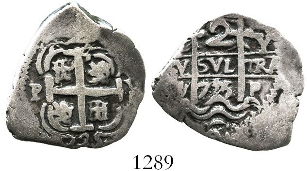Potosi, Bolivia, cob 2 reales, 1725Y, (Louis I). S-P43b; KM-34; CT-38. 5.4 grams. Broad, thin (and underweight) flan with good full pillars and cross, 2 dates and mintmarks, 3 assayers, richly toned Fine.