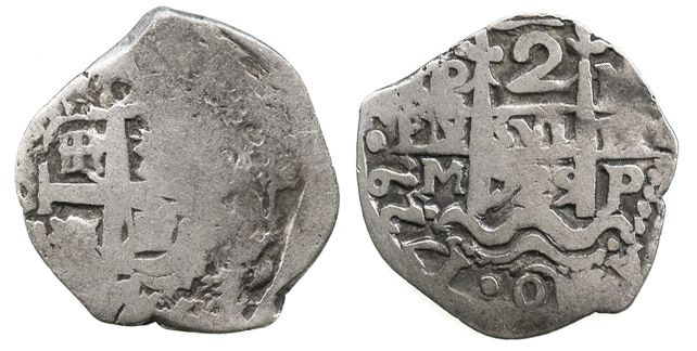 Potosi, Bolivia, cob 2 reales, 1729M. S-P44; KM-29a; CT-1350. 5.6 grams. One hundred percent full date in legend (rare thus) and decent full pillars-and-waves, but the cross mostly flat and only About Fine overall, with contrasting toning.