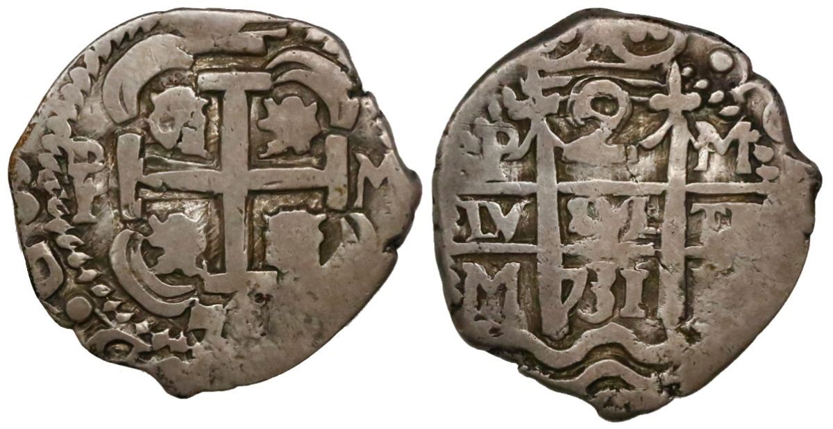 Potosi, Bolivia, cob 2 reales, 1731M. S-P44; KM-29a; CT-1352. 5.79 grams. Good full pillars-and-waves and cross, two dates, three assayers and mintmarks, roundish flan with lightly toned fields, AVF.