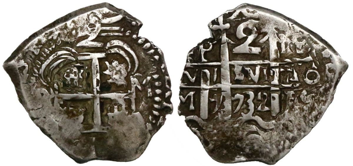 Potosi, Bolivia, cob 2 reales, 1732M. S-P44; KM-29a; CT-1353. 6.83 grams. Bold full pillars and cross, three assayers, VF+ with toned fields, parts of edge slightly crude (as made).