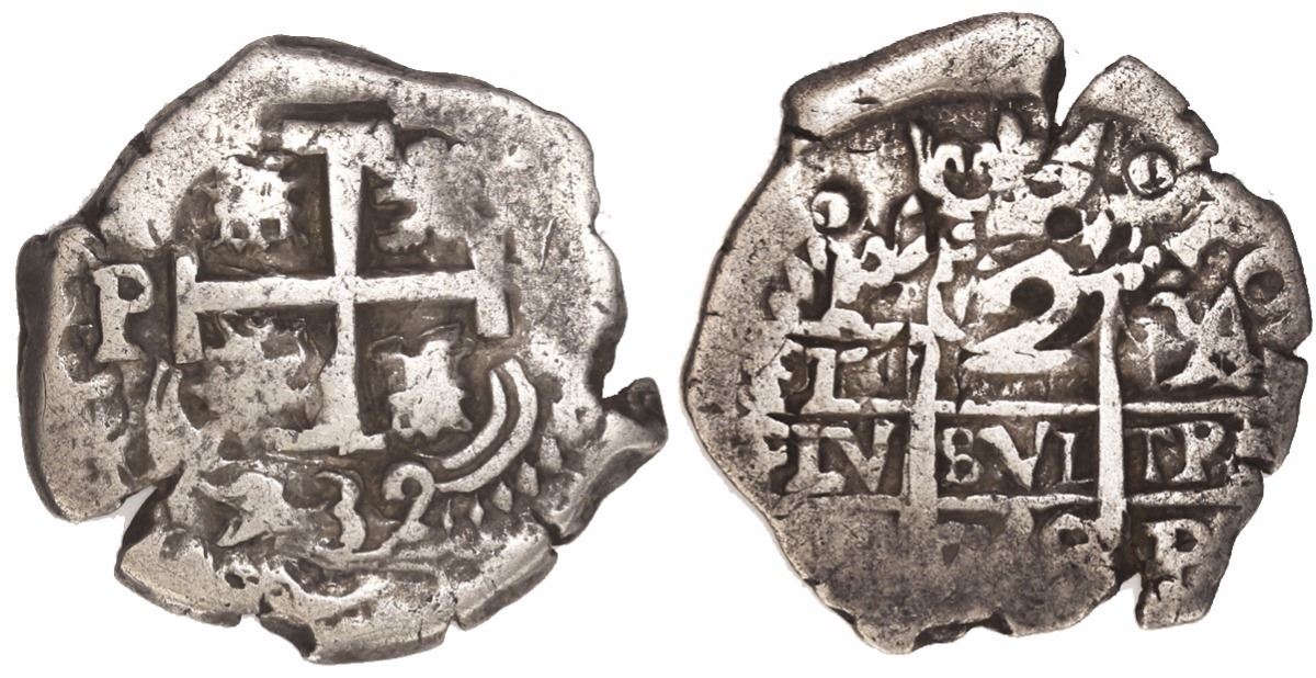 Potosi, Bolivia, cob 2 reales, 1732YA, rare. 6.69 grams. Good full cross, full pillars with nice full crown, two dates and three mintmarks, VF with lightly toned fields, edge-split.
