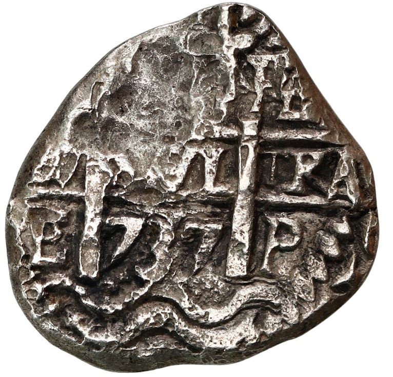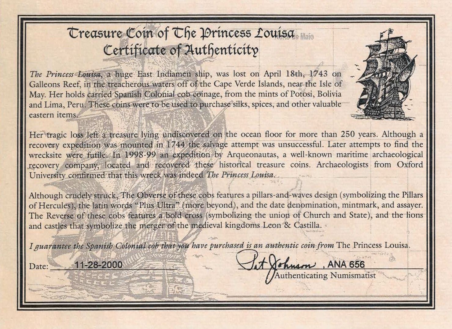 Potosi, Bolivia, cob 2 reales, 1737 E, ex-Pat Johnson. S-P46; KM-29a; Cal-916. 4.75 grams. Sharp AU details on most of the pillars side despite the saltwater corrosion, two dates and assayers visible. With Pat Johnson tag and certificate from November 2000. Recovered from: Princess Louisa, sunk in 1743 off the Cape Verde Islands, west of Africa.