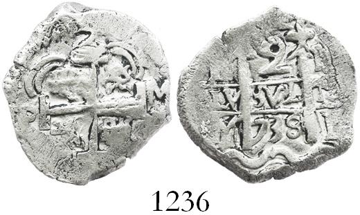 Potosi, Bolivia, cob 2 reales, 1738M. S-P47; KM-29a; CT-1363. 6.1 grams. Bold full pillars, full but crude cross, 2 full assayers and bold date, slightly silvery (salvaged) but with black bits around details.