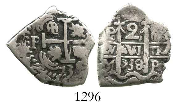 Potosi, Bolivia, cob 2 reales, 1738M. S-P47; KM-29a; CT-1363. 6.5 grams. Strangely pointed shape, with good full pillars and cross, 2 dates, 3 mintmarks, Fine+ with toned fields (good contrast).
