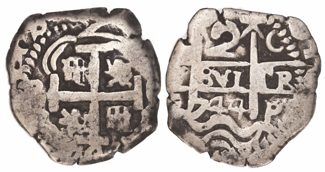 Potosi, Bolivia, cob 2 reales, 1744C. 6.57 grams. Good full cross and pillars (the latter slightly off-center), Fine+ with toned fields.