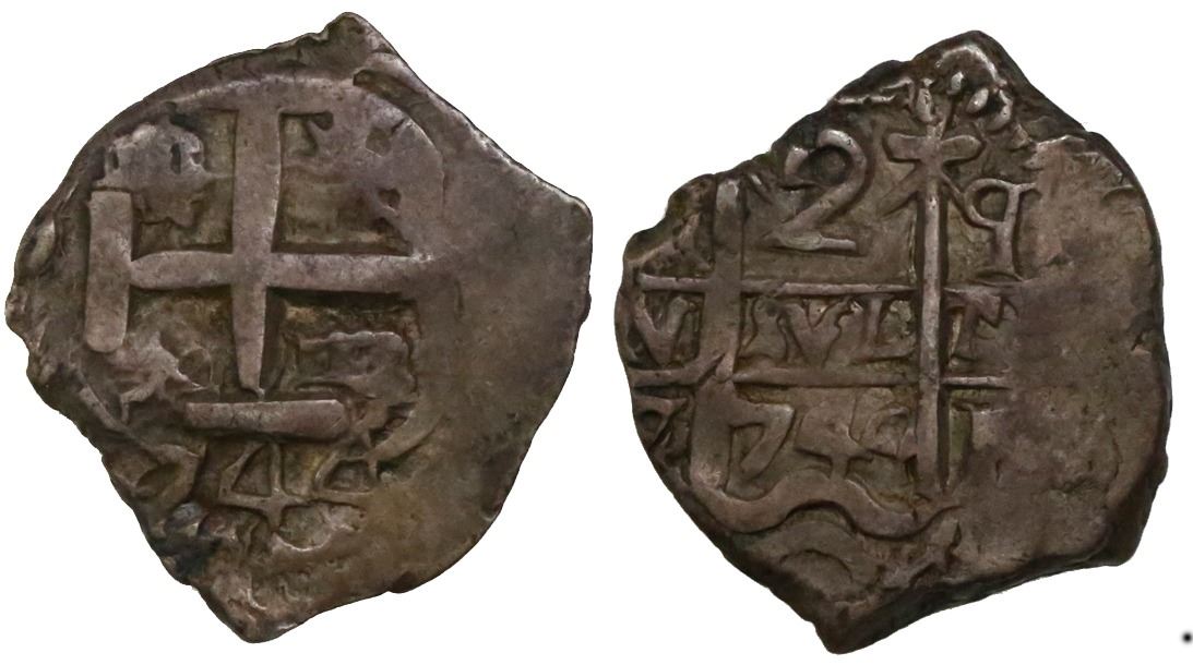 Potosi, Bolivia, cob 2 reales, 1744q. S-P50; KM-29a; CT-1373. 6.63 grams. Richly toned and relatively high grade (XF) with nearly full cross and pillars (one pillar very bold), two full dates.