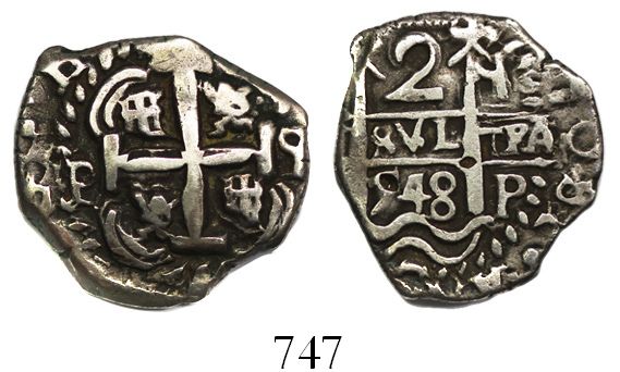 Potosi, Bolivia, cob 2 reales, 1748q. S-P50a; KM-38 ;CT-505. 6.52 grams. Choice full cross-lions-castles, nice but off-center full pillars-and-waves with bold date, two mintmarks and assayers, richly old-toned VF, excellent specimen for the period.