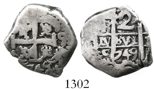 Potosi, Bolivia, cob 2 reales, 1749q. S-P50a; KM-38; CT-506. 6.8 grams. Good full pillars and cross, 2 dates and assayers, Fine with nicely toned fields (good contrast).