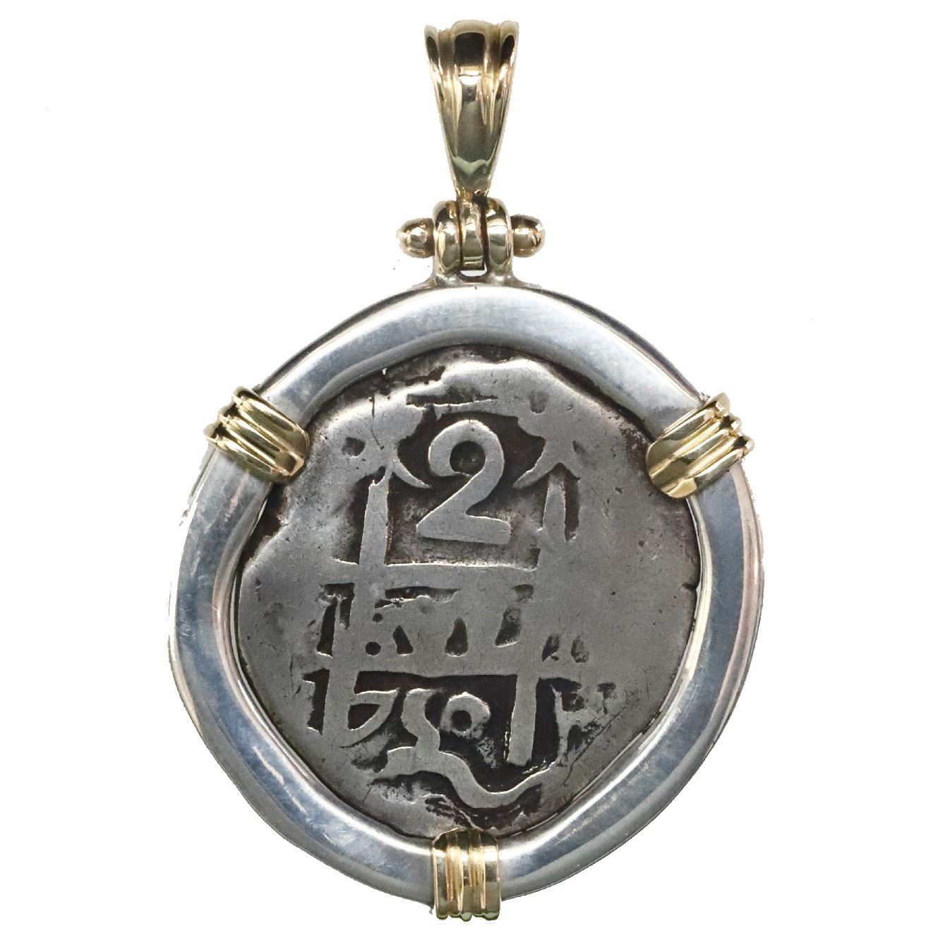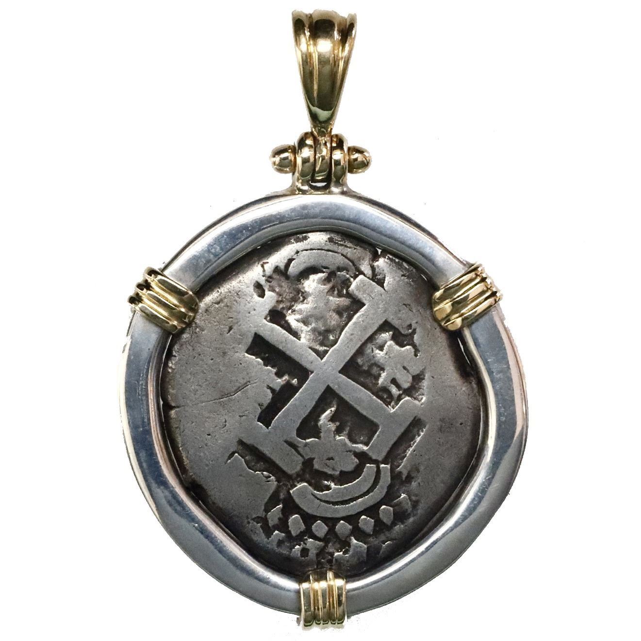 Potosi, Bolivia, cob 2 reales, 1750q, mounted pillars-side out in thick silver bezel with 14K gold prongs and shackle bail. 13.10 grams total. Good full cross with assayer to right (possibly q/E), well-centered pillars with bold date in between, Fine with contrasting toning in crevices, thick and sturdy mounting.