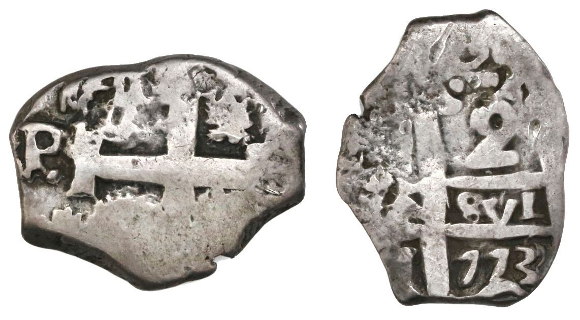 Potosi, Bolivia, cob 2 reales, 1773(V-Y), rare. S-P59; KM-43; CT-1375. 6.43 grams Long flan following the axis of the pillars, enabling a full and bold date (rare thus), popular as the final year of cobs, the last digit clearly punched over another digit that actually looks more like a 0 than a 2, Fine with dark toning in crevices.
