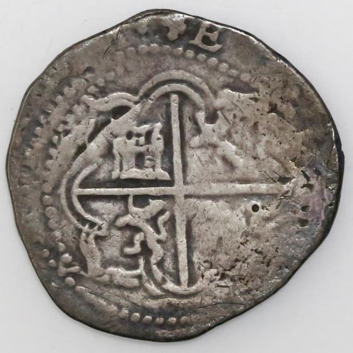 Potosi, Bolivia, cob 2 reales, Philip II, assayer A/B. S-P11; KM-3.2. 6.42 grams. Deeply toned Fine+ with bold P-A and fairly clear A/B, full shield and cross, plugged hole at one end.