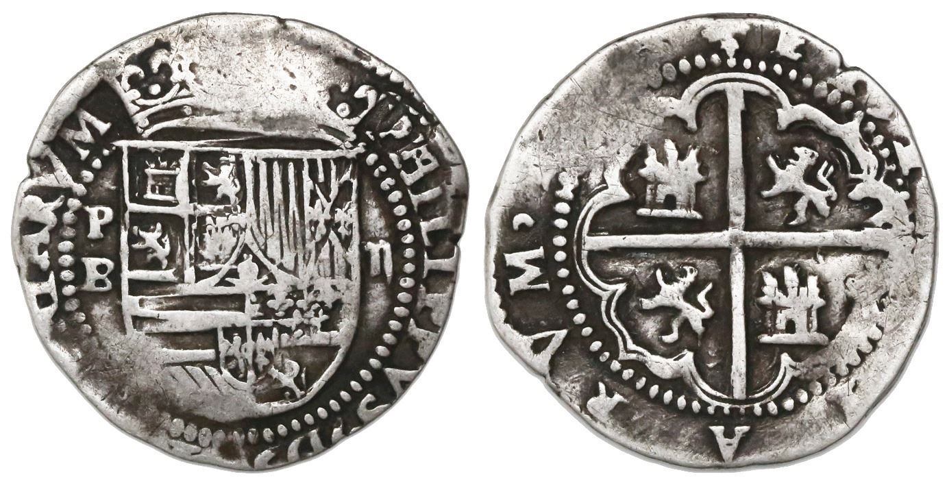 Potosi, Bolivia, cob 2 reales, Philip II, assayer B (1st period,  Lima style ).
