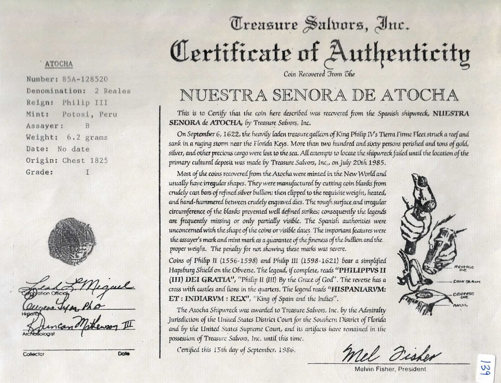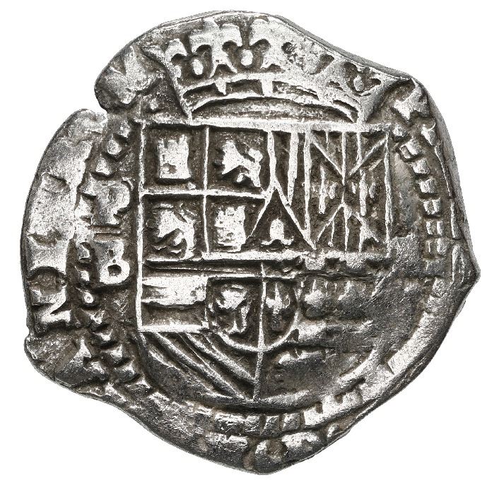 Potosi, Bolivia, cob 2 reales, Philip II, assayer B (3rd period), Grade 1. S-P10; KM-3.2; Cal-370. 6.21 grams. Very choice, with bold full details all over (well-centered cross and shield), nearly full crown, no corrosion, toned in crevices. With Fisher tag and certificate 128520. Recovered from: Atocha, sunk in 1622 west of Key West, Florida