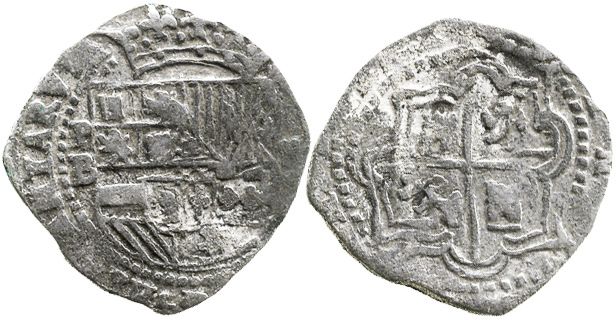 Potosi, Bolivia, cob 2 reales, Philip II, assayer B (4th period), Grade 1.
