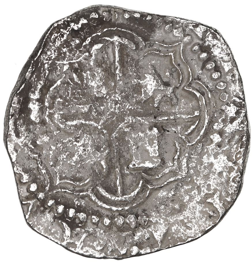 Potosi, Bolivia, cob 2 reales, Philip II, assayer B (5th period), Grade 1. S-P12; KM-3.2; Cal-370. 5.88 grams. Choice full shield with bold P-B to left, weaker full cross with surface corrosion, toned in crevices. With original Fisher tag and certificate 86A-191185, pedigreed to the J.P. Silberman Estate.Recovered from: Atocha, sunk in 1622 west of Key West, Florida.