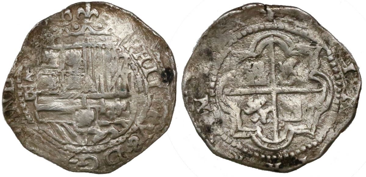 Potosi, Bolivia, cob 2 reales, Philip II, assayer B (5th period), border of x's on obverse, border o