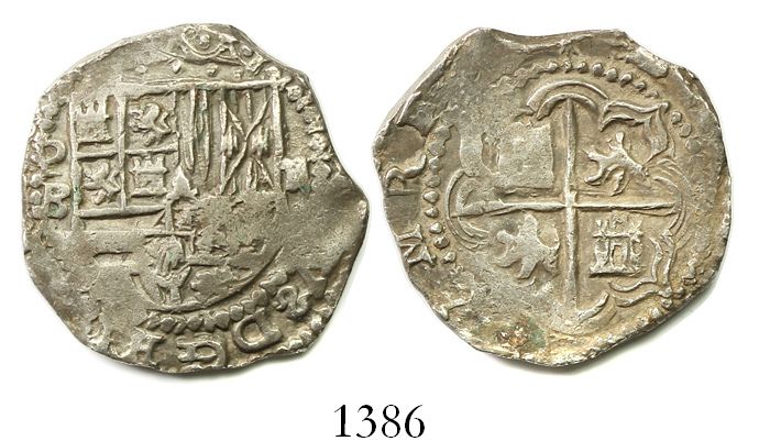 Potosi, Bolivia, cob 2 reales, Philip II, assayer B (5th period).