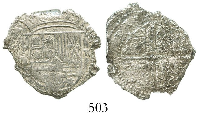 Potosi, Bolivia, cob 2 reales, Philip II, assayer C under erasure, Grade 4, very rare. S-P5; KM-3.2. 3.2 grams. Choice full crown and shield with full P-erasure-C, but the entire cross side moderately corroded, as is the edge (a part of which is bent), still a very important coin numismatically. With Fisher certificate #237049 (misattributed to La Plata). Recovered from: Atocha, sunk in 1622 west of Key West, Florida