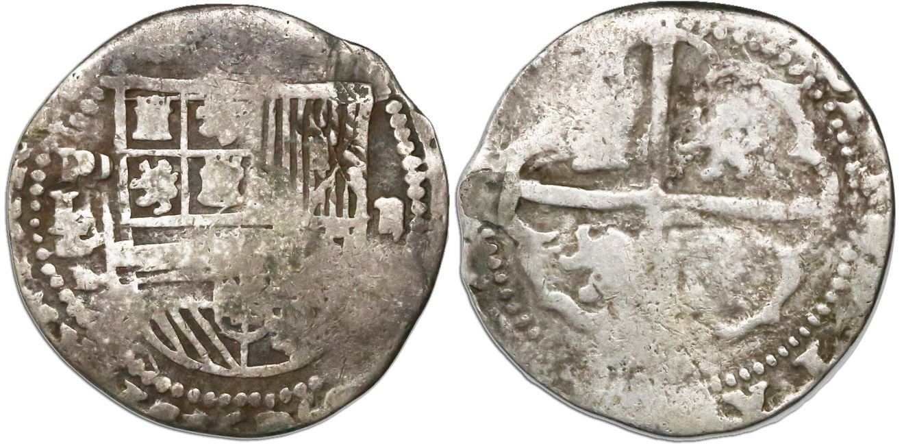 Potosi, Bolivia cob 2 reales, Philip II, assayer L (1st period), with L/L/L/M below mintmark P to left, rare. S-P3; KM-3.3. 5.50 grams. Crude VG (possibly shaved) but with clear multiple over-assayer, lightly toned.