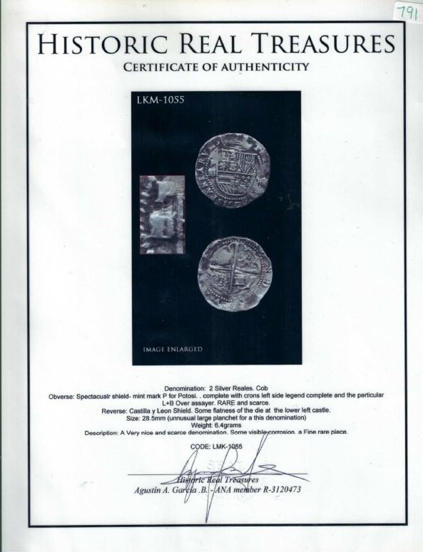 Potosi, Bolivia, cob 2 reales, Philip II, assayer L/M, rare. S-P3; KM-3.2. 6.41 grams. Very broad flan with lots of legend, well-detailed full shield and cross, AXF with patchy toning, old scratches and a couple tiny punchmarks, bold full assayer. With Historic Real Treasures (Augi Garcia) photo-certificate.