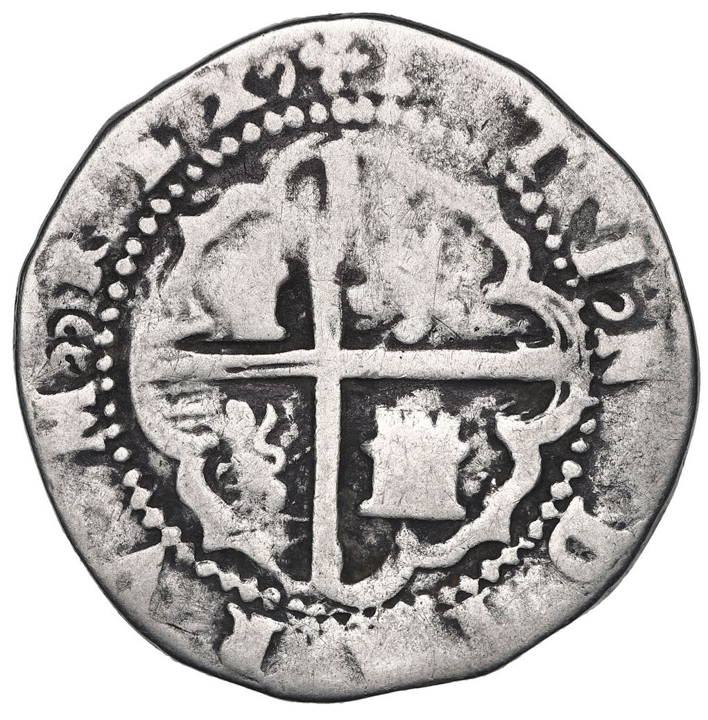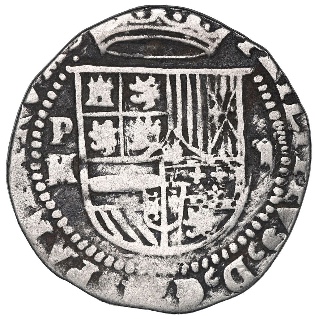 Potosi, Bolivia, cob 2 reales, Philip II, assayer M/R to left, very rare, ex-Ugaz. S-P2; KM-3.2; Cal-unl. 6.21 grams. Choice full details (including most of legends and crown) despite obvious wear (Fine with contrasting toning), the P-M/R to left and denomination ii to right very bold and clear, a prime example of Stallard obverse Die A that was made for assayer R but apparently never used until assayer M. Pedigreed to the Jorge Ugaz collection.