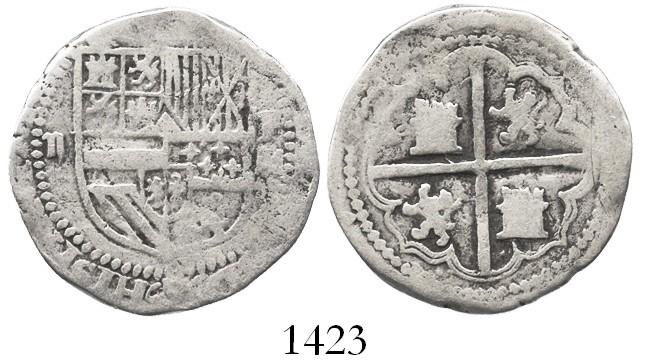 Potosi, Bolivia, cob 2 reales, Philip II, assayer M to right, rare. S-P2; KM-3.2. 6.4 grams. Choice full cross, bold denomination ii to left and weaker but full P-M to right of full shield, Fine with contrast.