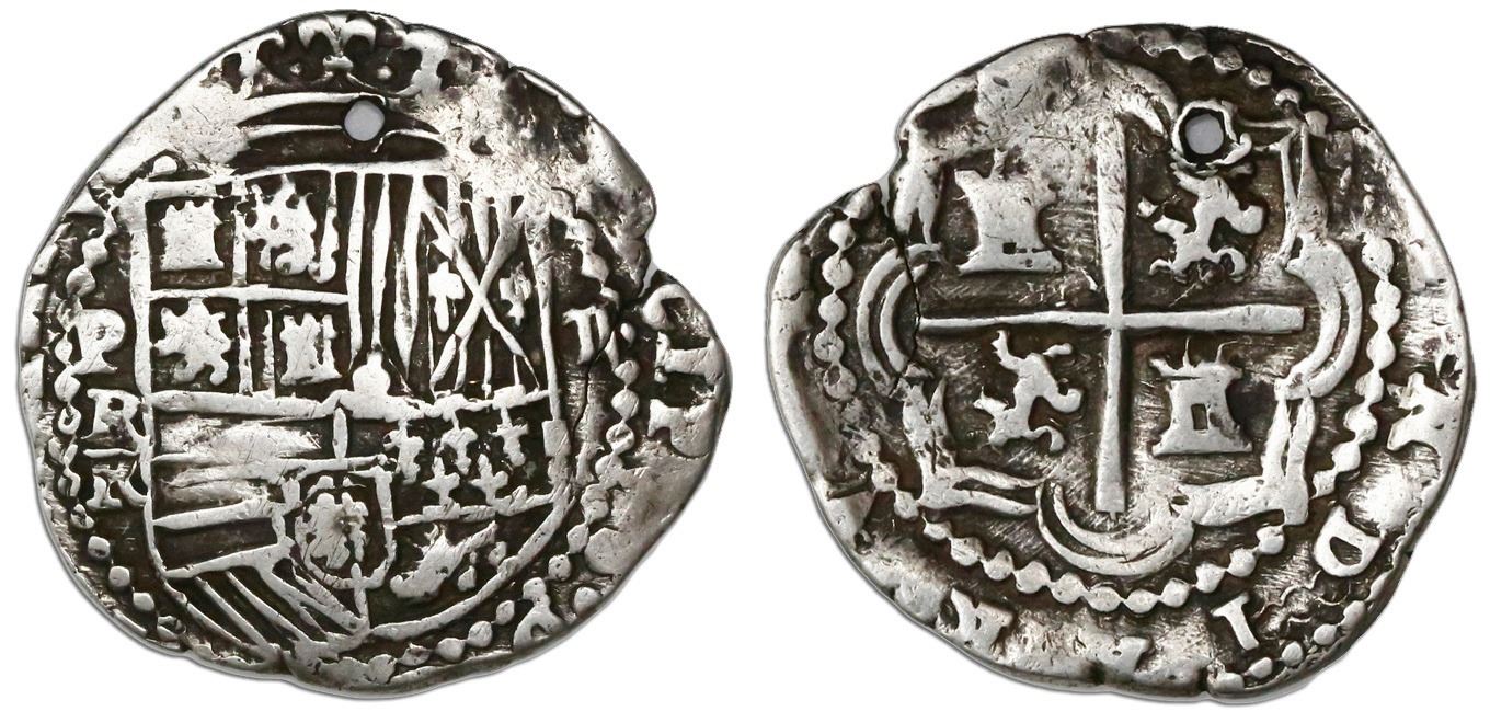 Potosi, Bolivia, cob 2 reales, Philip II, assayer R (Ramos), rotated lions (unique). S-P13; KM-3.2; CT-510. 6.59 grams. Bold full cross with lions curiously rotated 90 degrees clockwise, choice full shield (slightly doubled) with full P-R and denomination, VF with toned fields, holed at top of shield.