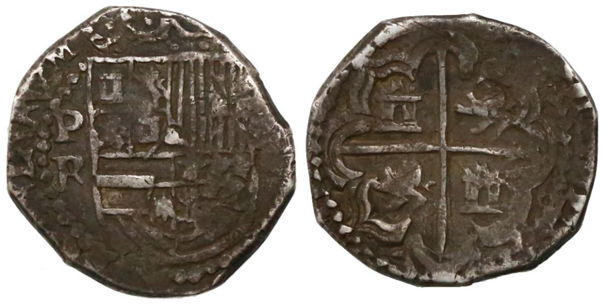 Potosi, Bolivia, cob 2 reales, Philip II, assayer R (Ramos). S-P13; KM-3.2. 6.62 grams. Richly toned VF+ with full shield and cross, full P-R lacking bottom-right serif as usual.