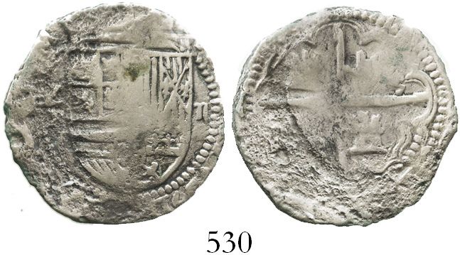 Potosi, Bolivia, cob 2 reales, Philip II, assayer not visible, Grade 3. KM-3.2. 5.6 grams. Broad flan with good full shield, moderate corrosion around part of edge, spotty toning. With original Fisher photo-certificate #212. Recovered from: Santa Margarita, sunk in 1622 west of Key West, Florida