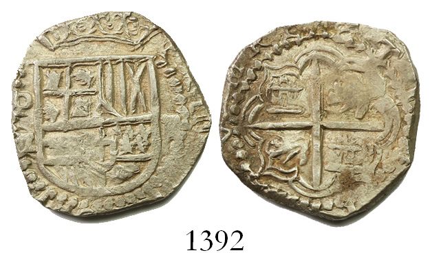 Potosi, Bolivia, cob 2 reales, Philip III, assayer M/Q, rare, ex-Karon. S-P18; KM-8. 6.60 grams. Bold VF+ with light toning, good full shield and cross, desirable pedigree. Pedigreed to the Karon collection (Ponterio, March 1990), lot #499.
